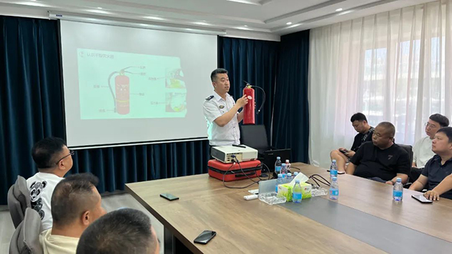 會議室內,黃教官通過課件和實操相結合的形式,用一件件真實發(fā)生的案例向大家講解了各類火災的特點與應對方法,以及遇到汛情及臺風時的處理辦法等,并通過“提、拔、握、壓”四字口訣教會大家如何正確使用滅火器。