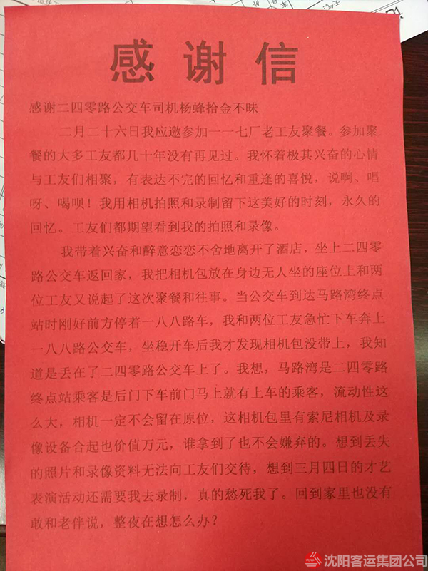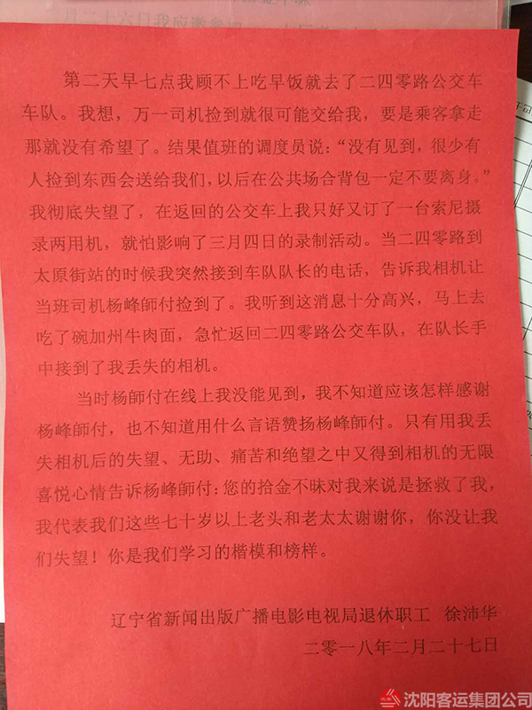 原來,當(dāng)日下午徐沛華老人剛剛參加完老工友聚會(huì),在乘坐240路公交車回家時(shí)將攜帶的攝影包遺落在車上,到家后才發(fā)現(xiàn)自己的攝影包丟失了。老人回想可能是遺落在240路車上了,他抱著試試看的態(tài)度來到240車隊(duì),令他沒想到的是,相機(jī)完好無損的在那里等待它主人的到來,失而復(fù)得的喜悅讓老人激動(dòng)不已,老人說,“昨晚我一夜沒有睡好,相機(jī)里的照片和視頻對(duì)我來說是非常珍貴的,要是丟了我真不知道怎么辦才好,真的非常感謝駕駛員楊峰同志......”隨后,老人親自把“拾金不昧 弘揚(yáng)正氣”的錦旗送到了楊峰手中,“楊師傅的這種拾金不昧的精神是雷鋒精神的一種傳承,是現(xiàn)在年輕人學(xué)習(xí)的榜樣”,老人激動(dòng)的說。在公交車這個(gè)不足十平米的車廂里,楊峰用自己的善舉為城市文明傳遞著一份正能量。