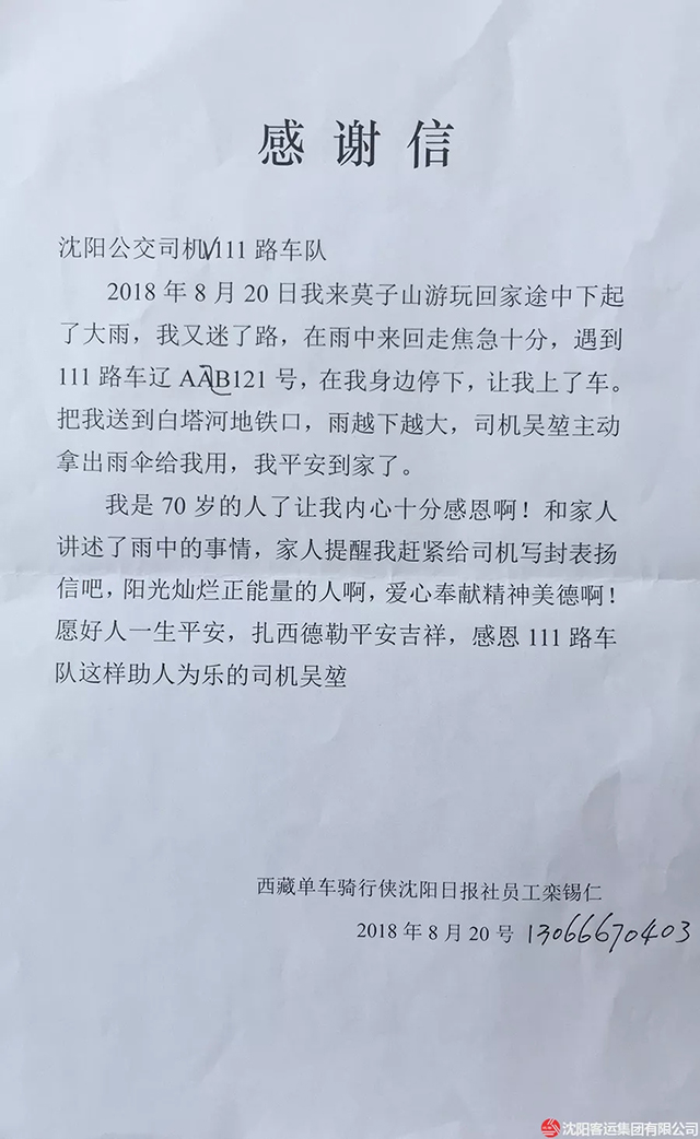 27日一大早,老人來(lái)到了鑫暢公司V111車隊(duì),送來(lái)了一封感謝信!見(jiàn)到吳坤第一句話就說(shuō):“太感謝你了小伙子,如果你那天沒(méi)看見(jiàn)我,不送我坐地鐵回家,我今天一定不會(huì)安好的站在這里…”說(shuō)著老人流出了感激的淚水。