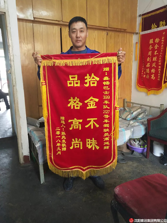 399路0016號(hào)單車駕駛員高延輝,在打掃車廂衛(wèi)生的時(shí)候發(fā)現(xiàn)了老人的包,并第一時(shí)間交給了隊(duì)長(zhǎng)。經(jīng)查看包內(nèi)現(xiàn)金1500余元、一部蘋果手機(jī)及各種證件。經(jīng)過(guò)近三個(gè)小時(shí)的努力尋找,最終聯(lián)系到了失主,接到車隊(duì)打來(lái)的電話的張老失哽咽的說(shuō)不出話來(lái)。當(dāng)天下午張老就為車隊(duì)送來(lái)了錦旗:品格高尚,拾金不昧。