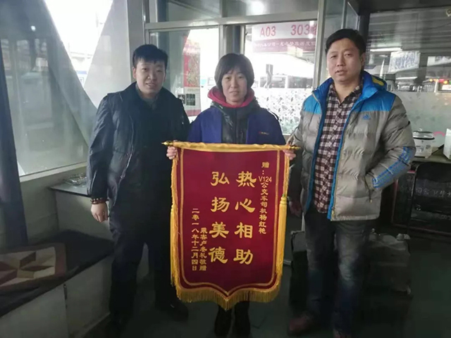 次日,盧女士懷著激動(dòng)的心情,手里捧著錦旗來到龍之夢(mèng)終點(diǎn)站,親自將錦旗交給了楊紅艷手中并合影留念。